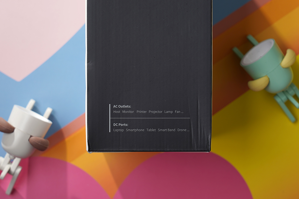 유그린 GaN 65W 멀티탭 + 멀티충전기 박스 옆쪽을 살펴보면 AC 아울렛의 경우에는 모니터나 프린터 그리고 프로젝터 등을 연결할 때 사용할 수 있고 DC 포트를 이용해서는 스마트폰이나 태블릿 등을 충전시켜 줄 수 있습니다.