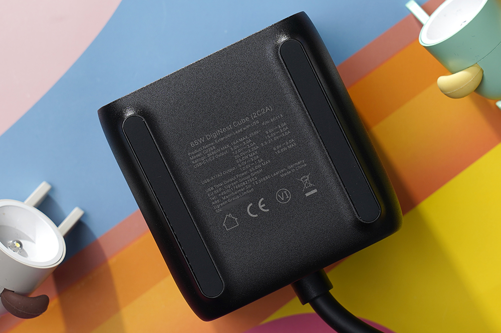 유그린 GaN 65W 멀티탭 + 멀티충전기의 본체 크기는 84 x 85 x 84mm이고 케이블을 포함한 무게는 약 628g입니다. 일체형 케이블의 두께가 제법 두꺼운 편이어서 묵직한 느낌을 주는 편입니다. 특히 질화갈륨(GaN) 기반의 제품이라서 상대적으로 크기가 콤팩트하다는 장점이 있습니다.