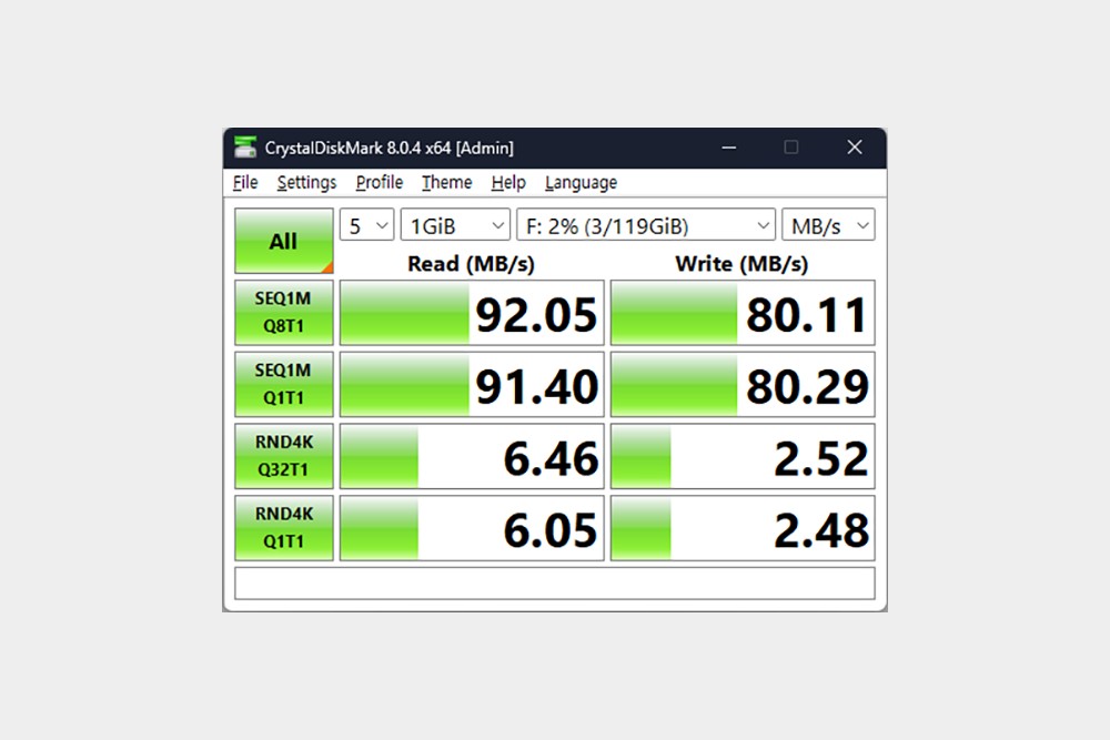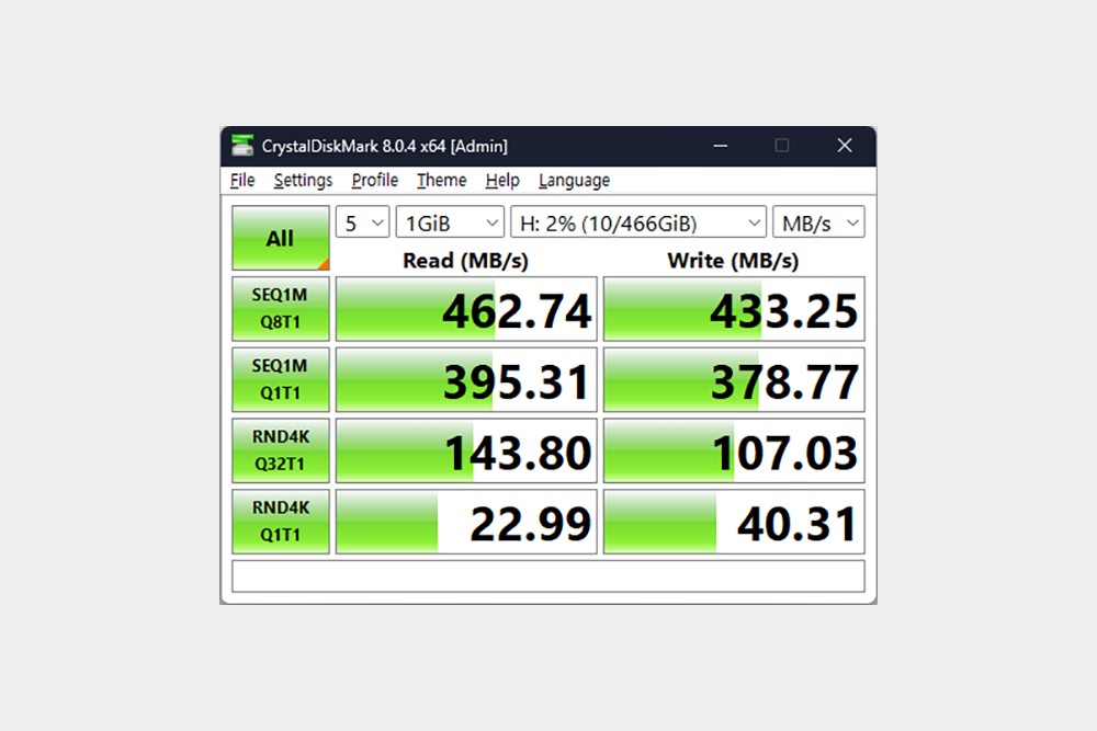 유그린 X-키트 홀더 허브 노트북 스탠드에 SD카드를 연결해서 속도를 확인해 보며 읽기는 92MB/s, 쓰기는 80MB/s 정도가 측정되었습니다. 참고로 최대 104MB/s의 SD/TF 속도를 제공한다고 합니다. 그리고 USB-A 3.0 포트에 외장 SSD를 연결해서 속도를 측정해 보면 읽기는 462MB/s, 쓰기는 433MB/s 정도가 측정되었습니다. 5Gbps 최대 속도에 가깝게 측정된 것을 확인할 수 있습니다.