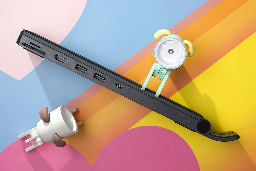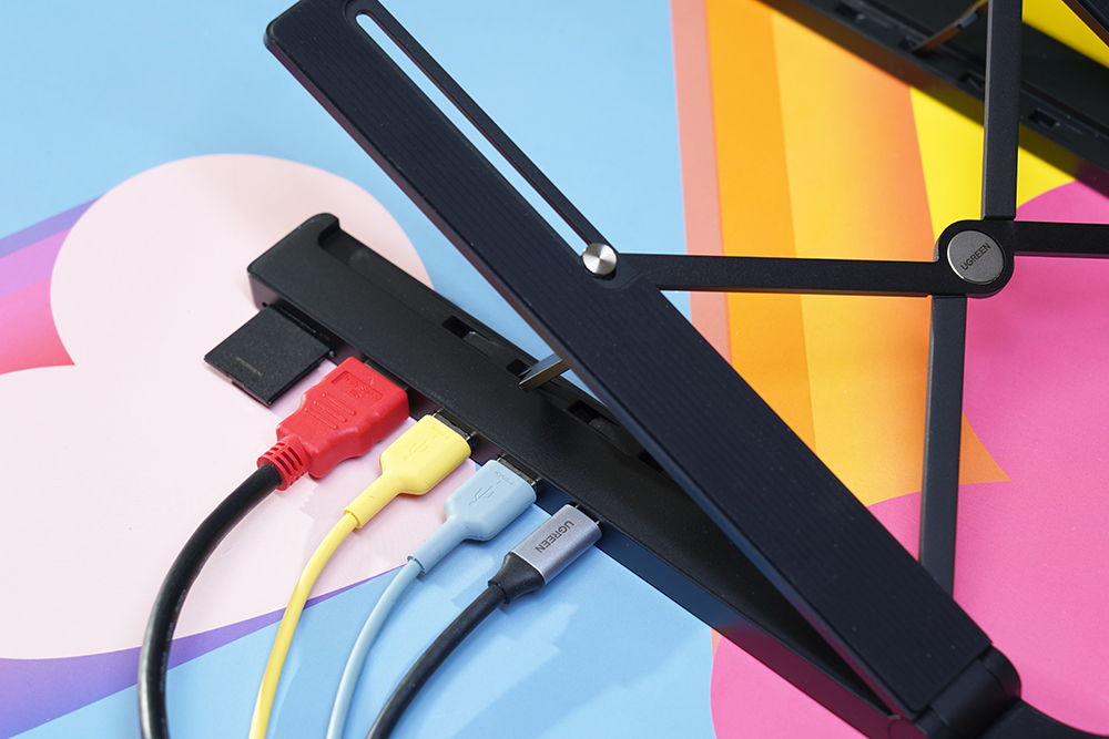 유그린 X-키트 홀더 허브 노트북 스탠드의 옆쪽을 살펴보면 마이크로SD / SD 카드 슬롯과 HDMI 그리고 2개의 USB-A 포트가 배치된 것을 확인할 수 있습니다. 그리고 맨 오른쪽에 배치된 USB-C 포트를 이용해서 노트북과 연결할 수 있습니다.
