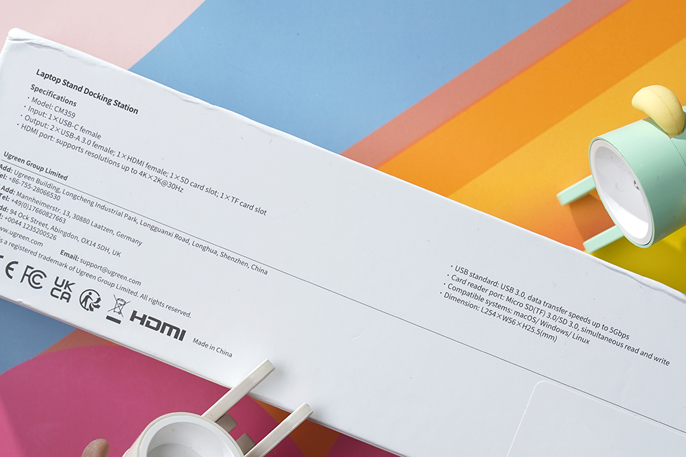유그린 X-키트 홀더 허브 노트북 스탠드의 스펙을 살펴보면 모델명은 CM359이고 1개의 USB-C 포트를 이용해서 2개의 USB-A 3.0(5Gbps) 포트와 HDMI(4K 30Hz), SD/마이크로SD(TF) 카드 슬롯을 사용할 수 있습니다.