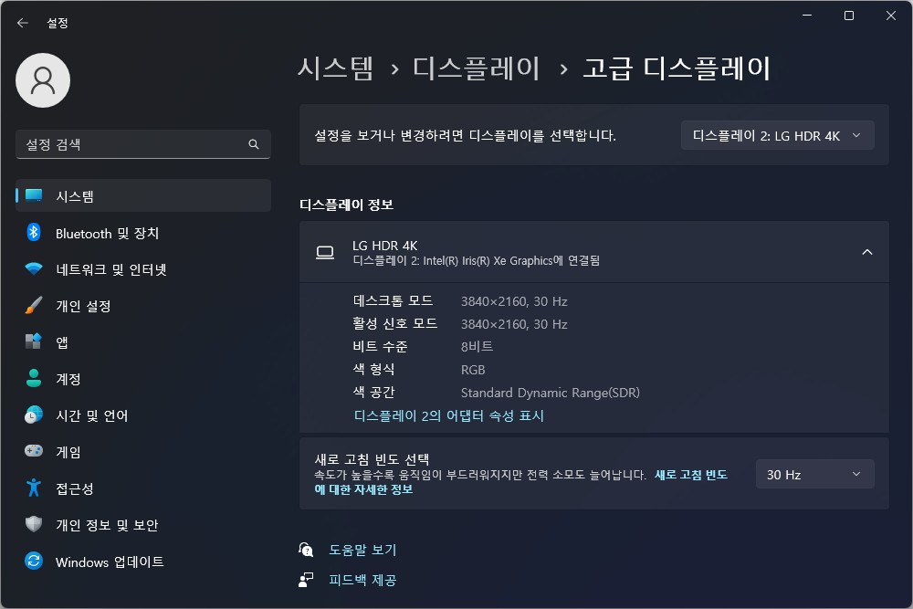 유그린 X-키트 홀더 허브 노트북 스탠드에 4K 해상도의 모니터를 연결해 보면 3840 x 2160 30Hz로 연결되는 것을 확인할 수 있습니다. 게임을 플레이하기에는 무리가 있겠지만 간단하게 자료를 확인하고 영상을 시청할 때는 30Hz가 크게 거슬리지 않으리라고 예상합니다.