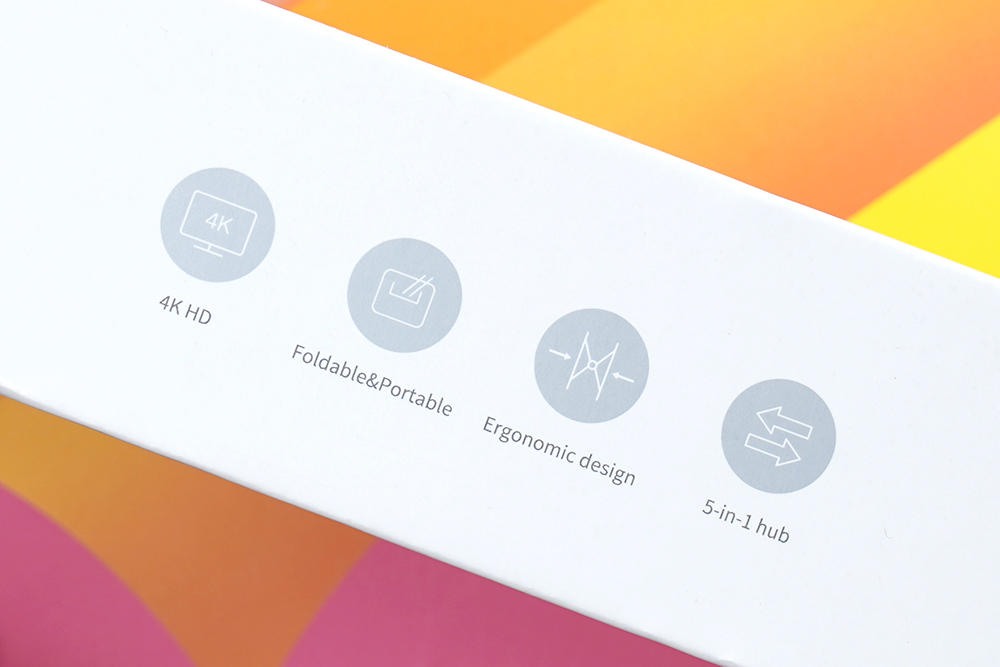박스의 옆쪽에는 유그린 X-키트 홀더 허브 노트북 스탠드의 특징이 표시되어 있습니다. 우선 5-in-1 USB-C 허브에 탑재된 HDMI 단자를 이용해서 4K 출력을 지원합니다. 그리고 접을 수 있는 구조로 제작되어서 간편하게 휴대할 수 있다는 점도 편리한 부분입니다.