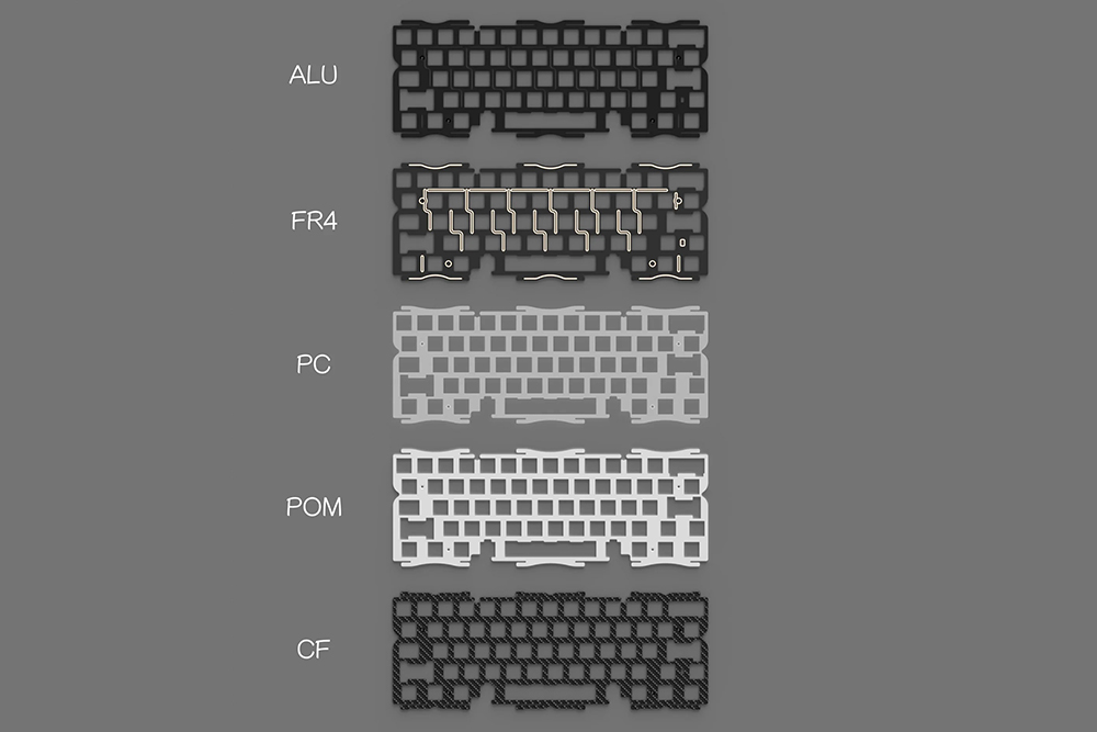 Qwertykeys QK60 R2의 보강판의 경우에는 POM, PC, ALU, FR4와 카본 파이버 중에서 선택할 수 있습니다. 참고로 카본 파이버의 가격이 조금 더 비싼 편인데요. 취향에 따라서 선택하는 것이 좋을 것 같습니다.