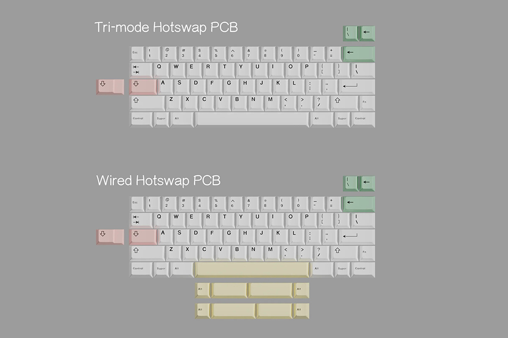 Qwertykeys QK60 R2의 PCB 기판의 경우에는 Tri-mode Non-flex cut PCB과 Wired Non-flex cut PCB 중에서 선택할 수 있습니다. 참고로 무선 버전의 경우에는 VIA와 Vial을 지원하지 않습니다.