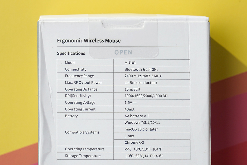 박스의 뒷면을 살펴보면 유그린(UGREEN) MU101 무선 마우스의 스펙이 표시되어 있습니다. 블루투스 5.0과 2.4G 듀얼 모드를 지원하고 최대 10미터(15미터:2.4G) 거리에서 사용할 수 있습니다. 그리고 DPI는 1000, 1600, 2000, 4000으로 설정할 수 있습니다.