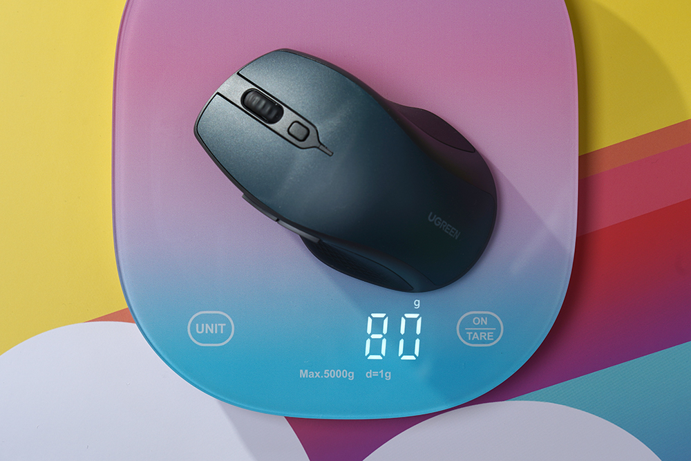 유그린(UGREEN) MU101 무선 마우스의 무게는 배터리를 제외하고 80g 정도로 측정되었습니다. 건전지의 무게에 따라서 약간의 차이가 있겠지만 일상적으로 사용하는데 크게 부담이 되는 편은 아니라고 판단되었습니다.