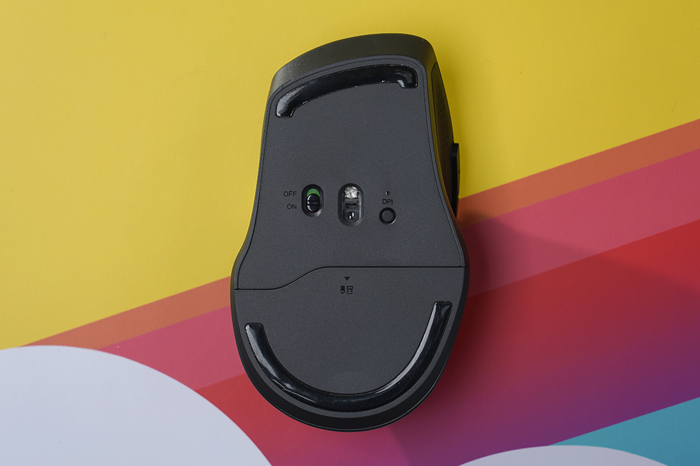 바닥을 살펴보면 위아래에 마우스 피트가 부착되어 있어서 책상 위에서 부드럽게 미끄러지도록 도와주는 역할을 합니다. (필름이 부착되어 있으니 사용할 때 제거해야 합니다.) 그리고 최대 4000DPI를 지원하는 광학 센서와 전원 스위치 그리고 DPI 전환 버튼이 배치되어 있습니다.