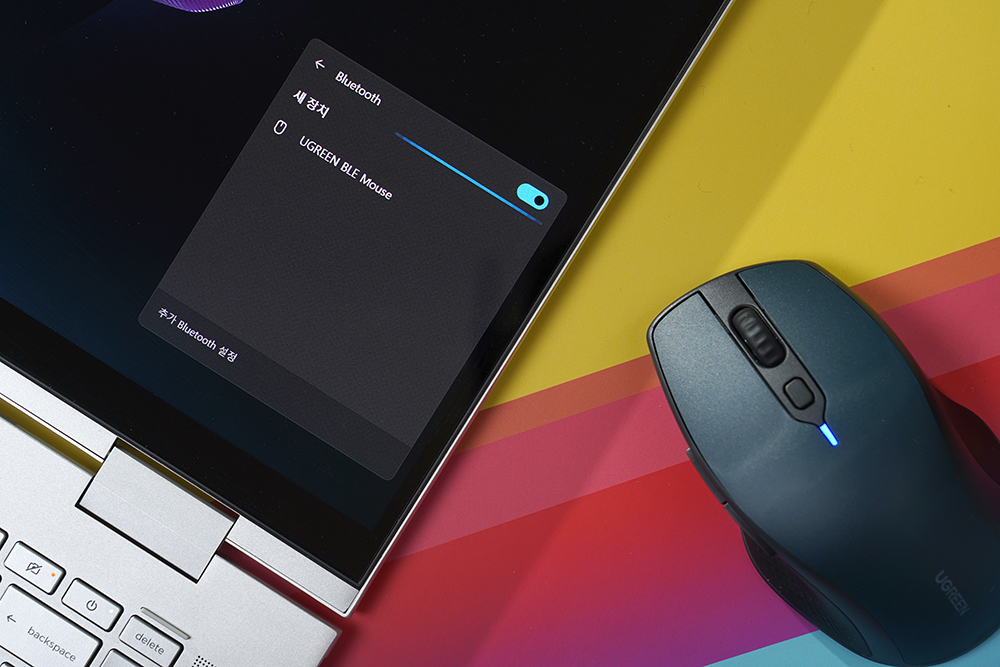 블루투스 기능을 이용하면 2.4G USB 수신기를 장착하지 않고도 무선으로 노트북과 같은 장비와 연결해서 사용할 수 있습니다. 연결 방법은 간단한 편인데요. 스위치 버튼을 눌러서 LED가 파란색으로 깜빡이면 노트북의 블루투스 기능을 활성화해서 UGREEN BLE Mouse를 검색해서 연결해주면 됩니다.