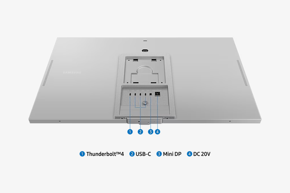 삼성 고해상도 뷰피니티 S90PC 5K 모니터의 뒷면을 살펴보면 전문가를 위한 제품답게 심플하고 세련된 느낌으로 제작된 것을 확인할 수 있습니다. 전체적으로 애플의 제품들과 함께 사용하면 매칭이 좋을 것으로 예상됩니다. 참고로 Apple 기기의 콘텐츠를 미러링할 수 있는 Apple AirPaly 기능을 지원합니다.