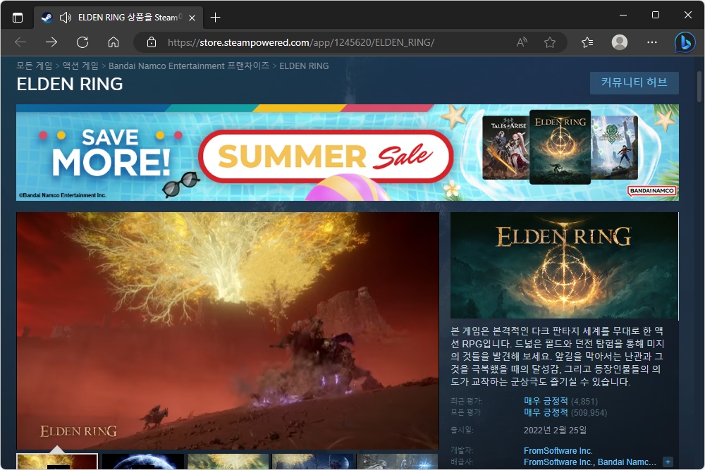 가장 먼저 살펴볼 게임은 프롬 소프트웨어(FromSoftware)의 엘든 링(Elden Ring)입니다. 다크 판타지 액션 RPG 게임으로 분류되고 있고 소울 시리즈나 세키로와 같은 게임을 좋아하는 분들은 반드시 플레이해 보아야 할 작품이라고 할 수 있습니다. 참고로 게이머나 평론가들의 평가도 최상입니다. 가격은 30% 할인을 해서 45,360원이고 Deluxe Edition 버전은 60,760원입니다.
