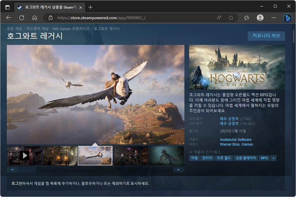 아발란체 소프트웨어(Avalanche Software)의 호그와트 레거시(Hogwarts Legacy)도 해리 포터의 세계관을 게임으로 잘 구현했다는 평가를 받는 작품입니다. 그래서 책이나 영화의 팬이라면 한 번 정도는 플레이해볼 만한 가치가 있습니다. 참고로 가격은 20% 할인을 해서 55,040원에 판매하고 있고 디지털 디럭스 에디션은 64,160원입니다.
