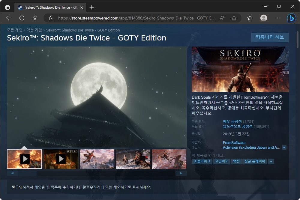 세키로: 섀도우 다이 트와이스(SHADOWS DIE TWICE)는 엘든 링의 개발사인 프롬 소프트웨어의 작품입니다. 게임 자체가 상당히 어려운 것으로 평가받고 있고 반대로 성취감이 상당히 높다는 평가를 받고 있고 열정적인 마니아도 많은 게임입니다. 참고로 가격은 50% 할인을 해서 29,900원에 판매되고 있습니다.