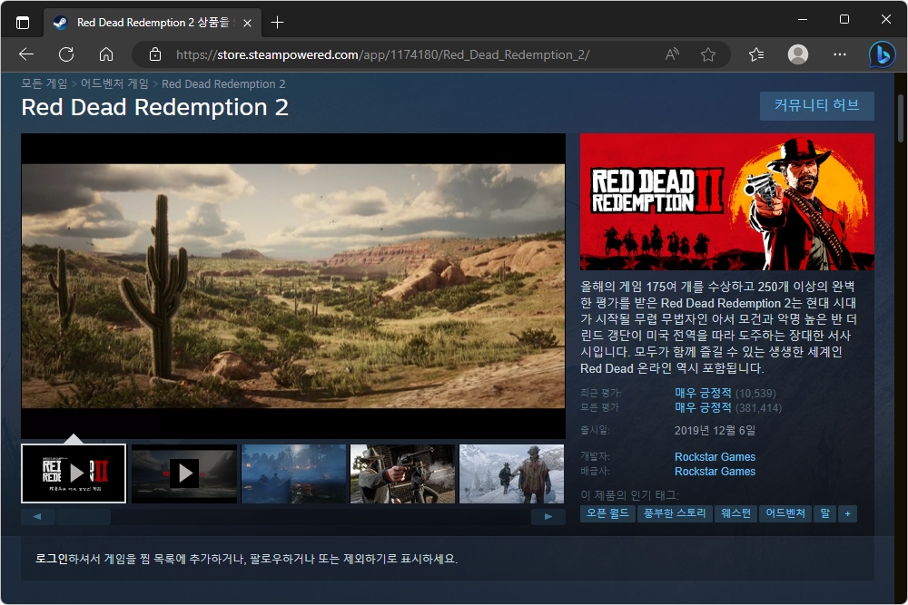락스타 게임즈(Rockstar Games)의 레드 데드 리뎀션 2(Red Dead Redemption II)는 무조건 소장하고 있어야 하는 게임입니다. 참고로 가격은 67% 할인을 해서 21,780원이고 Ultimate Edition은 33,000원에 구매할 수 있습니다.