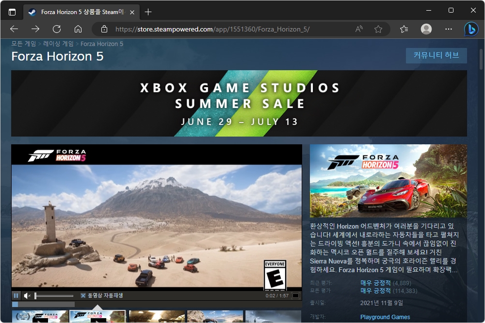 다음 작품은 플레이그라운드 게임즈(Playground Games)의 포르자 호라이즌 5(FORZA HORIZON 5)입니다. 오픈 월드 레이싱 게임으로 뛰어난 그래픽을 보여준다는 특징이 있습니다. 참고로 가격은 50% 할인을 해서 29,950원(스탠다드), 39,950원(디럭스), 49,950원(프리미엄)에 구매할 수 있습니다.