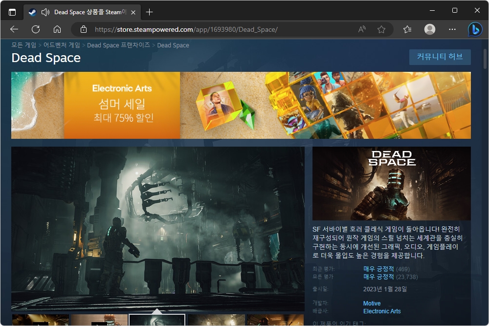 모티브 스튜디오(Motive Studios)의 데드 스페이스(Dead Space) 리메이크는 우주를 배경으로 호러 게임입니다. 리메이크가 이루어질 정도로 명작이라는 평가를 받고 있습니다. 참고로 가격은 30% 할인을 해서 46,200원에 판매되고 있습니다.