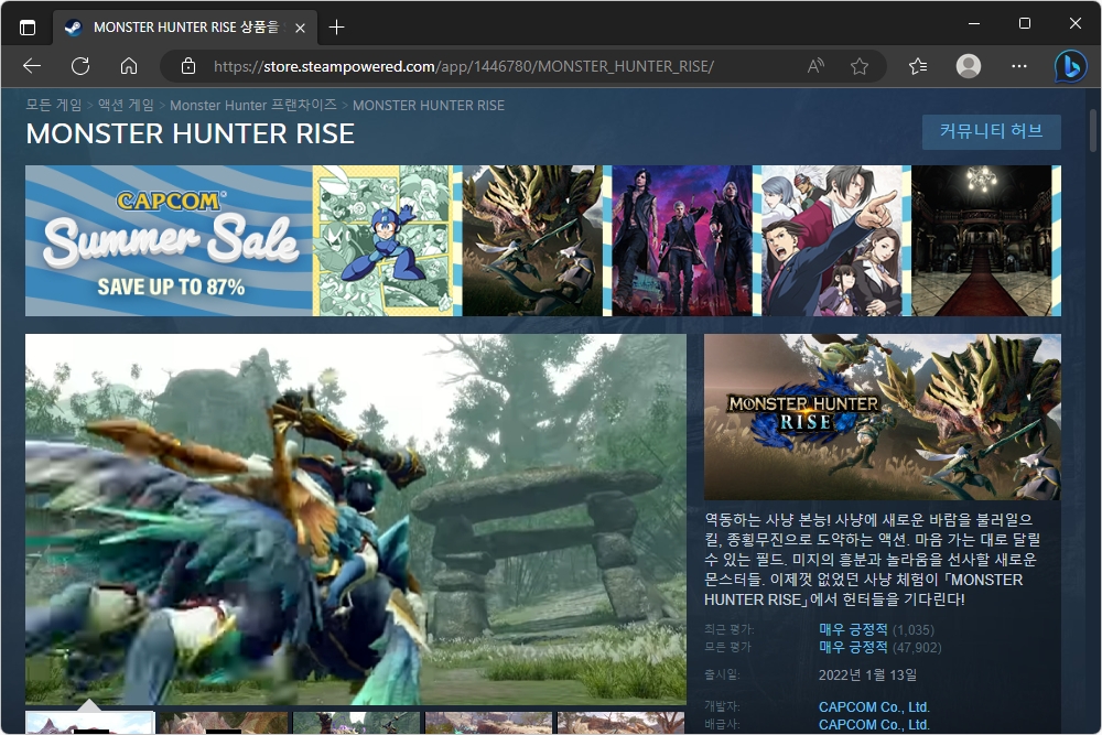 캡콤(CAPCOM)의 몬스터 헌터 라이즈(MONSTER HUNTER RISE)도 인기가 많은 게임 중의 하나이고 2022년 1월에 스팀으로 발매되었습니다. 가격은 60% 할인을 해서 19,360으로 부담이 되지 않으니 이번 기회에서 소장하는 것을 추천합니다.