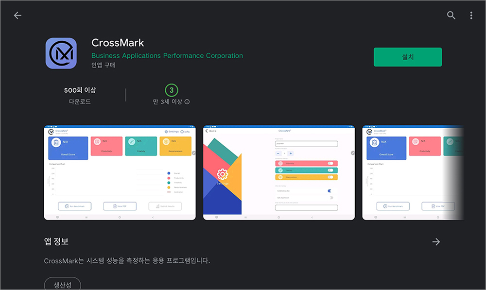 안드로이드 버전의 크로스마크(CrossMark)는 PC 버전과 같은 방식으로 사용할 수 있습니다. 런 벤치마크 프로그램을 선택하면 자신의 제품의 성능을 측정하기 시작하는데요. 시간이 조금 소요될 수 있습니다.
