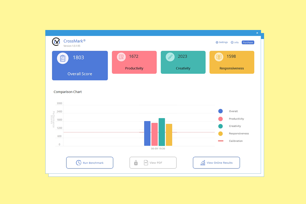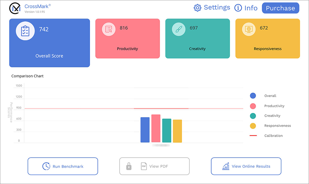 크로스마크(CrossMark)를 다운로드 받은 후에 Run BenchMark를 선택하면 일정 시간이 지난 후에 Overall Score(종합 점수)와 Productivity(생산성), Creativity(창의력), Responsiveness(반응성) 점수가 표시됩니다.
