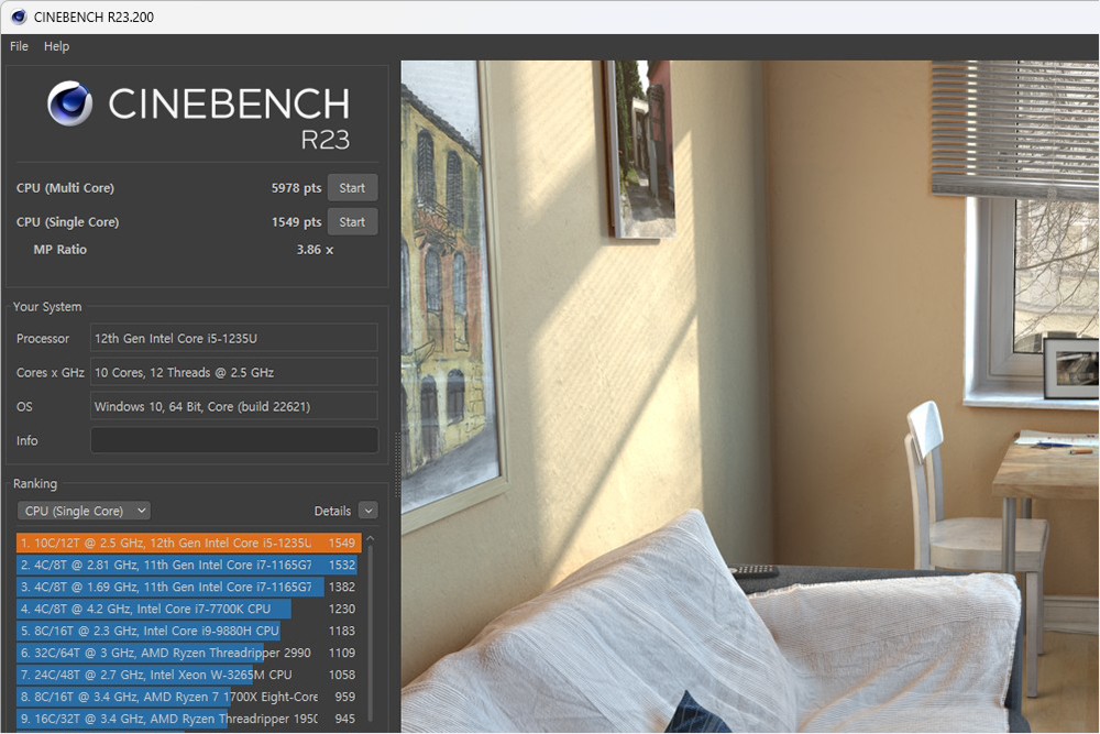 CINEBENCH R23.200 벤치마크 프로그램을 이용해서 12세대 인텔® 코어™ i5-1235U의 성능을 확인해 보면 멀티 코어는 5,978점(pts) 그리고 싱글 코어는 1,549점(pts)로 측정되었습니다.