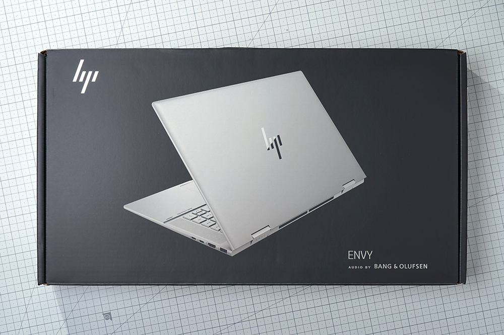 HP 엔비 x360 15의 박스는 세련된 블랙 컬러로 제작되었고 전면에는 본체의 모습과 함께 Bang & Olufsen 프리미엄 사운드 시스템을 탑재했다는 문구가 인쇄되어 있습니다.