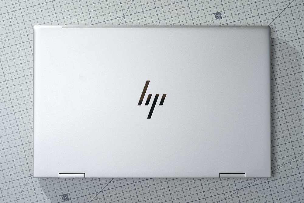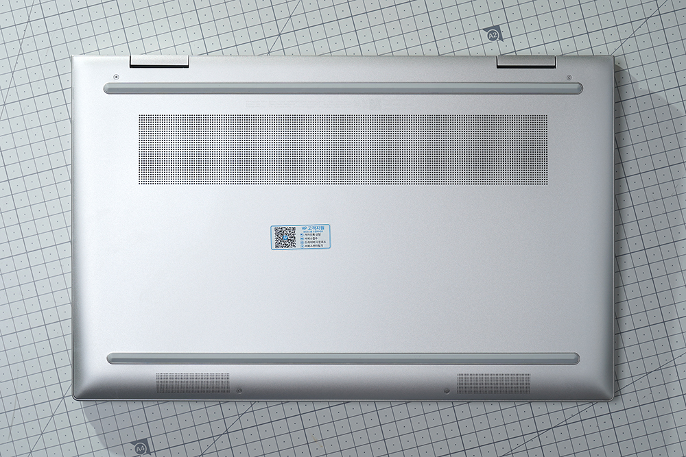 HP 엔비 x360 15의 바닥을 살펴보면 위아래에 긴 형태의 고무 지지대가 배치되어 있어서 책상 위에서 잘 미끄러지지 않습니다. 그리고 위쪽에는 발열 해소를 위한 통풍구가 준비되어 있습니다.