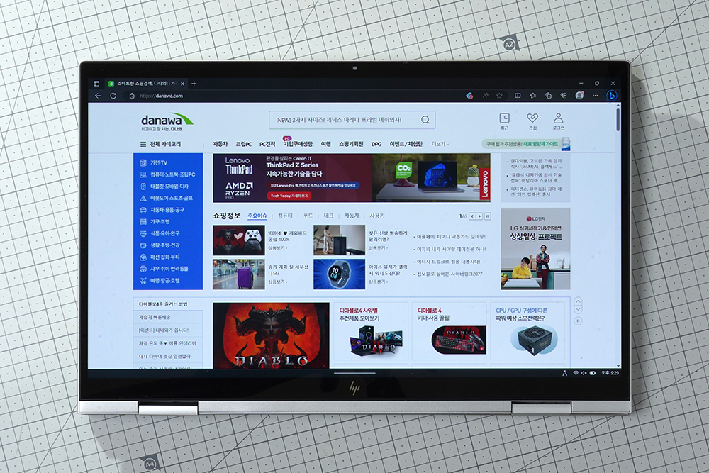 HP 엔비 x360 15의 두께는 18.6mm이고 무게는 약 1.72kg으로 측정되었습니다. 일반적인 노트북보다 구조가 복잡하다는 단점이 있는 2in1 노트북으로 설계되었다는 점을 고려하면 휴대성은 우수한 편이라고 판단되었습니다.