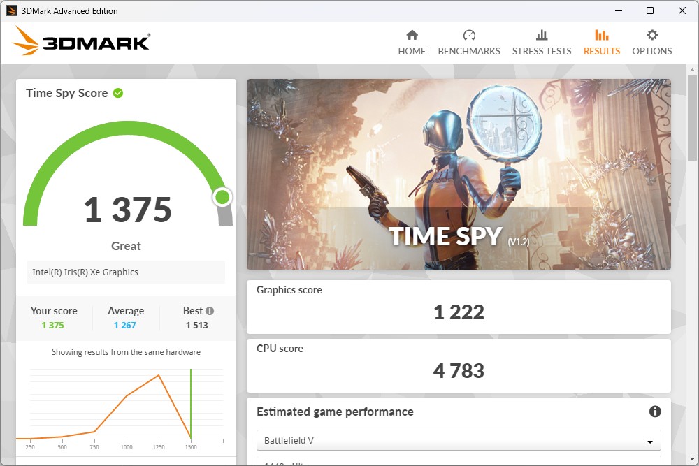 3DMARK 벤치마크 프로그램을 이용해서 인텔® Iris® Xe 내장 그래픽카드의 성능을 확인해 보면 파이어 스트라이크(FireStrike)는 3,667점, 타임 스파이(TimeSpy)는 1,375점이 측정되었습니다.