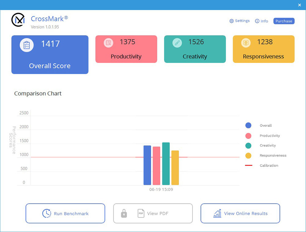 노트북의 전반적인 성능을 평가해주는 크로스마크(CrossMark)를 이용해서 HP 엔비 x360 15를 살펴보면 Overall Score는 1,417점, Productivity는 1,375점, Creativity는 1,526점, Responsiveness는 1,238점으로 측정되었습니다.