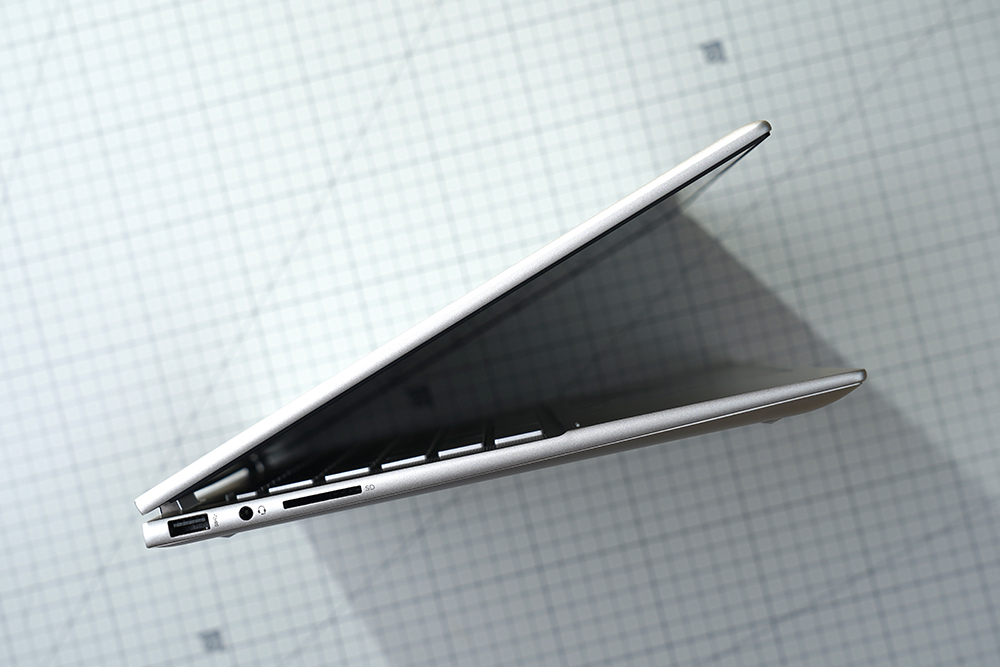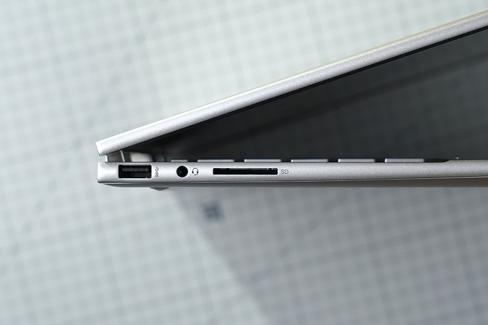 HP 엔비 x360 15의 입출력 포트를 확인해 보면 왼쪽에는 SuperSpeed USB Type-A 10Gbps와 헤드폰/마이크 콤보 그리고 멀티 포맷 SD 미디어 카드리더기가 배치되어 있습니다.