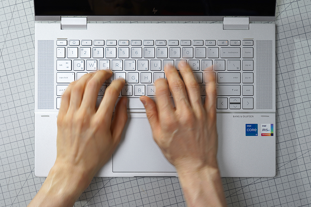 HP 엔비 x360 15의 키보드 키감은 깔끔한 느낌을 주는 편이고 키캡 간의 간격도 넉넉해 보였습니다. 그래서 장시간 문서 작업을 해도 크게 피로할 것 같지는 않습니다.