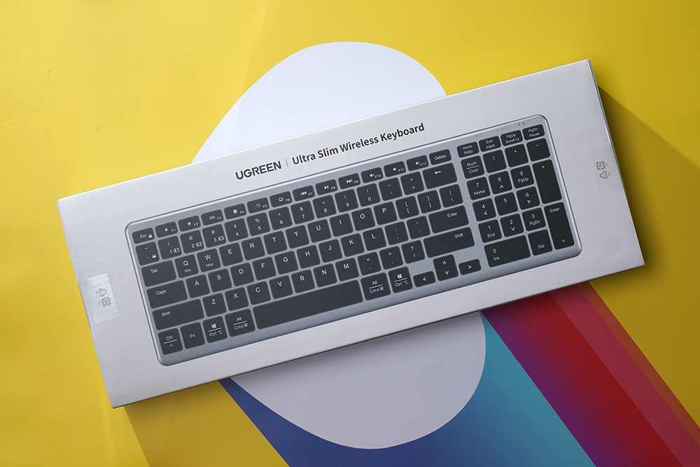 유그린 UGREEN 블루투스/2.4G 무선 키보드의 박스는 심플한 스타일로 디자인되었습니다. 그리고 전면에는 본체의 모습과 함께 위쪽에 Ultra Slim Wireless Keyboard라는 문구가 인쇄되어 있습니다.