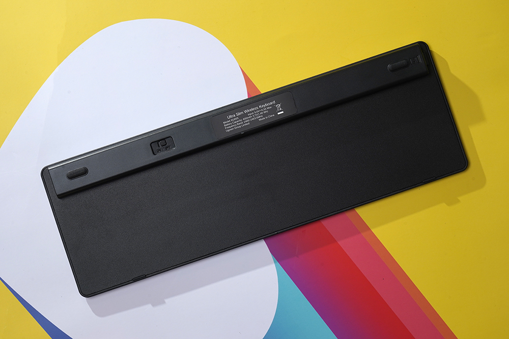 유그린 UGREEN 블루투스/2.4G 무선 키보드의 바닥을 살펴보면 심플한 스타일로 디자인되었고 모서리 부분에 고무 지지대가 배치되어 있어서 책상 위에서 잘 미끄러지지 않도록 도와줍니다.
