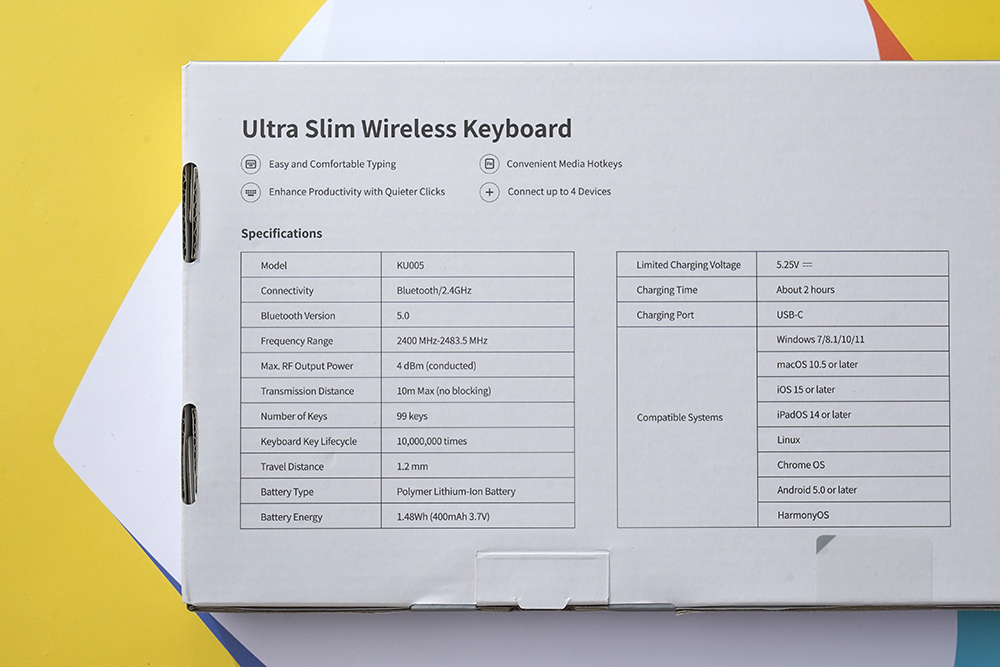 박스의 뒷면에는 유그린 UGREEN 블루투스/2.4G 무선 키보드의 특징이 설명되어 있는데요. 우선 모델 넘버는 KU005이고 블루투스 5.0과 2.4G 무선 동글을 이용해서 최대 4대의 장치와 연결해서 사용할 수 있습니다. 그 외에도 윈도우와 맥OS 그리고 리눅스와 같은 운영체제를 지원합니다.
