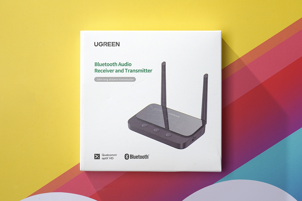 유그린 UGREEN 블루투스 송수신기의 박스는 심플한 스타일로 디자인되었습니다. 그리고 전면에는 최대 100미터 거리에서 사용할 수 있다는 내용과 함께 퀄컴 블루투스 aptX HD 기술을 지원한다는 문구가 표시되어 있습니다.