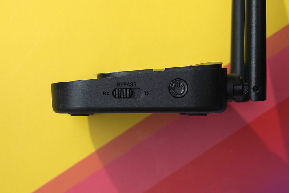 유그린 UGREEN 블루투스 송수신기의 옆쪽을 살펴보면 RX(수신)과 바이패스(BYPASS) 그리고 TX(송신) 모드로 전환할 수 있는 스위치와 전원/페어링/리셋 버튼이 배치되어 있습니다.