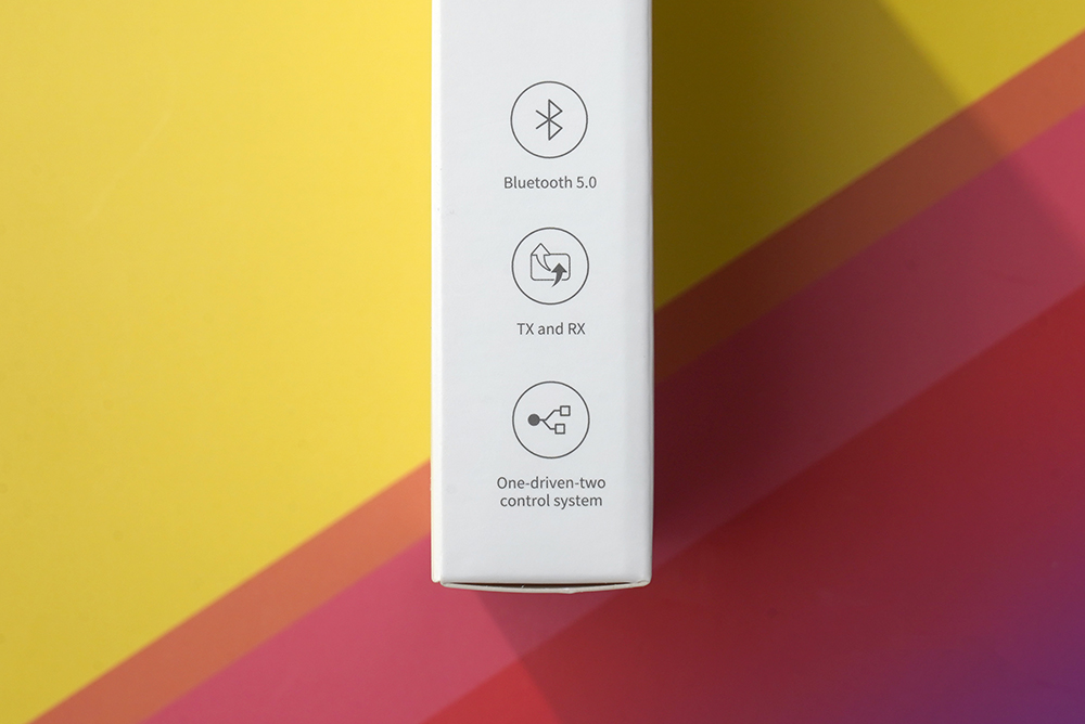 박스의 옆면을 살펴보면 블루투스 5.0을 지원하고 TX(송신)과 RX(수신)을 기능을 지원합니다. 그 외에도 두 대의 스마트폰을 연결해서 활용할 수 있는 기능도 탑재되었습니다.