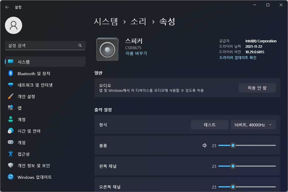 Bypass(바이패스) 모드에서는 SPDIF(오디오 광케이블) 포트를 통해서 수신 장비의 신호를 바로 우회할 수 있습니다. 그리고 USB 사운드 카드처럼 활용할 수 있는 기능도 제공하는데요. CSR8675라는 스피커가 컴퓨터에 인식된 것을 확인할 수 있습니다.