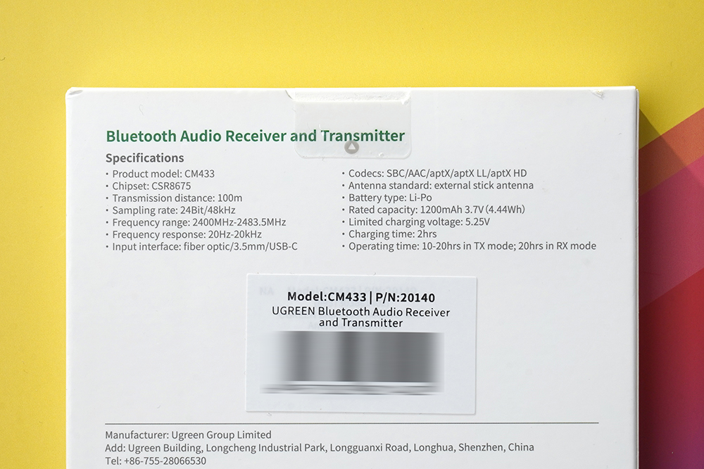 박스의 뒷면에는 유그린 UGREEN 블루투스 송수신기의 스펙이 표시되어 있습니다. 우선 모델 번호는 CM433이고 칩셋은 CSR8675가 사용되었습니다. 그리고 지원되는 블루투스 코덱은 SBC/AAC/aptX/aptX LL/aptX HD를 지원합니다.
