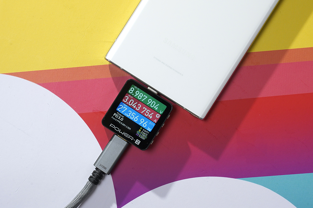 유그린(UGREEN) 100W GaN 고속 충전기를 이용해서 실제로 다양한 제품을 충전시켜 보면 우선 삼성 갤럭시 S22 울트라의 경우에는 9V, 3A 약 27W 정도로 충전이 진행되었습니다.
