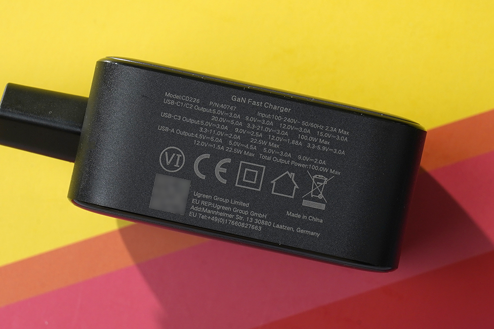 유그린(UGREEN) 100W GaN 고속 충전기의 아래쪽을 살펴보면 입출력 규격들이 설명되어 있습니다. 우선 모델은 CD226이고 P/N은 40747입니다. 그리고 입력은 프리볼트를 지원해서 커넥터만 맞으면 해외에서도 문제없이 사용할 수 있습니다.