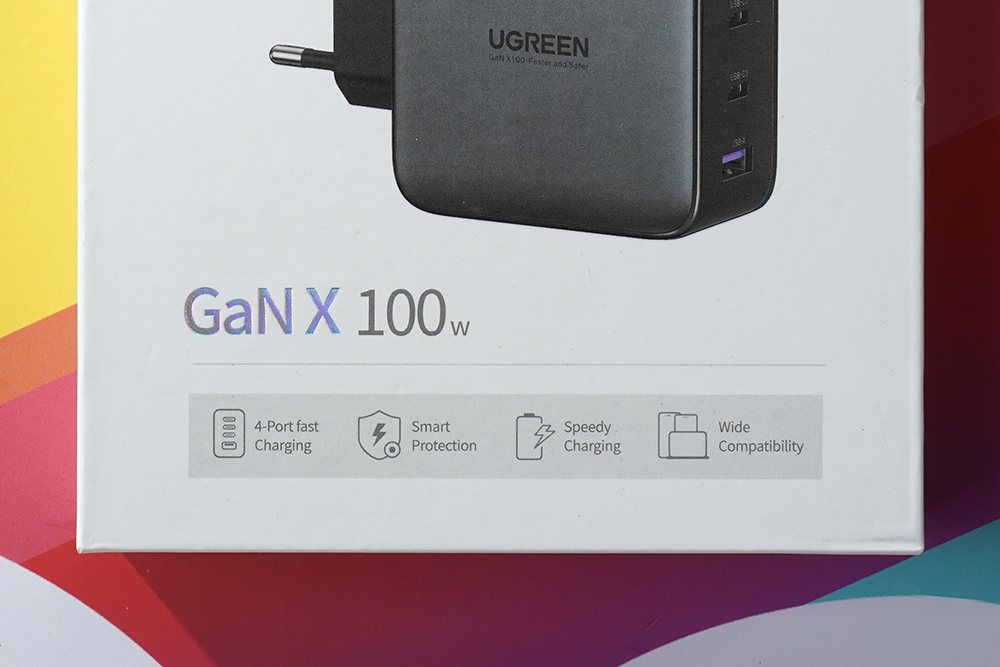 유그린(UGREEN) 100W GaN 고속 충전기의 박스는 깔끔한 스타일로 디자인되었고 전면에는 질화 갈륨(GaN) 기반의 고속 충전기라는 문구가 표시되어 있습니다. 참고로 GaN 소재의 충전기들은 고출력, 고효율이면서도 크기가 작다는 장점이 있습니다. 그래서 최근에 많이 활용되고 있습니다.