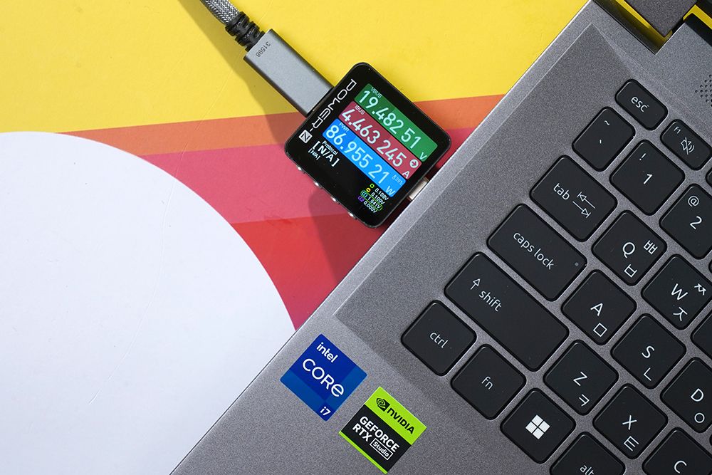 마지막으로 PD 100W 입력을 받을 수 있는 노트북에서는 19V, 4.4A 약 86W로 충전이 되었습니다. 상황에 따라서 90W까지 입력받을 수 있어서 빠르게 충전이 되었습니다. 참고로 M2 맥북 에어의 경우에는 30분 이내에 55% 정도까지 충전시켜줄 수 있다고 합니다.