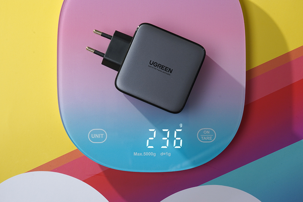유그린(UGREEN) 100W GaN 고속 충전기의 무게는 약 236g으로 측정되었습니다. 크기를 생각하면 조금은 묵직한 느낌을 주는 편입니다. 질화 갈륨(GaN) 소재 충전기들의 공통적인 단점 중의 하나라고 할 수 있습니다.