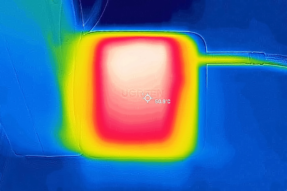 그런데 유그린(UGREEN) 100W GaN 고속 충전기와 같은 제품들은 빠르게 다른 제품들을 충전시켜줄 수 있어서 상대적으로 발열이 강한 편입니다. 그래서 충전 중에는 약 50도 정도까지 온도가 올라갔습니다. 그래도 온도에 따라서 출력을 조정하는 지능형 PMW 칩과 UL94-V0 등급의 쉘 방열 설계가 적용되어서 안전하게 사용할 수 있다고 합니다.