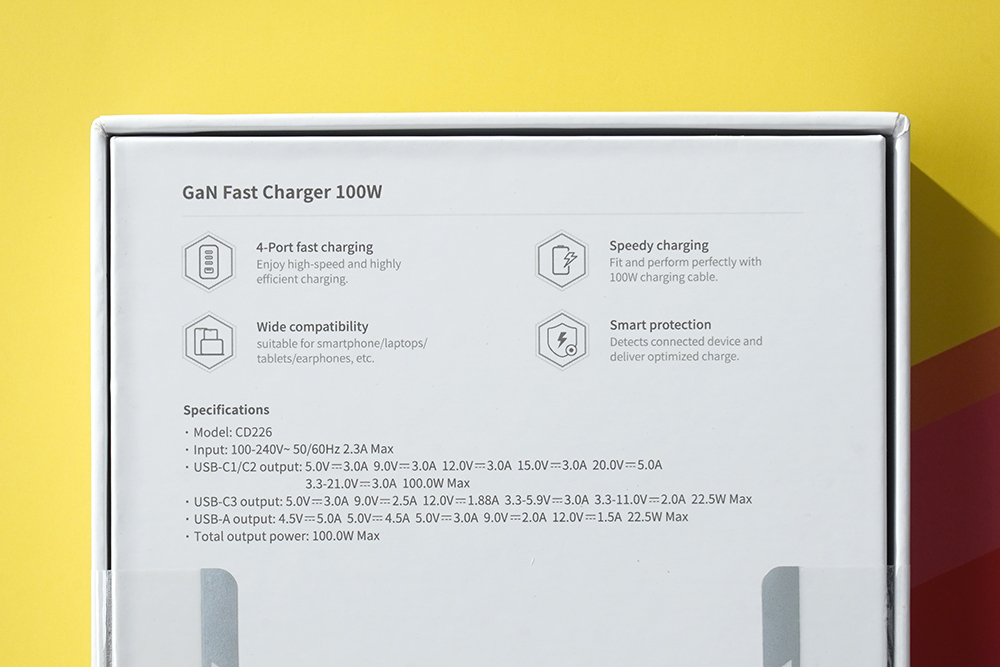 박스의 뒷면을 살펴보면 유그린(UGREEN) 100W GaN 고속 충전기의 특징들이 자세하게 설명되어 있습니다. 주목할만한 부분은 4 포트를 내장하고 있어서 동시에 다양한 제품들을 충전할 수 있고 PD3.0 (PD2.0) / QC4+ (QC4.0, QC3.0, QC2.0) / PPS / AFC / 애플 5V2.4A / BC1.2까지 다양한 고속 충전 프로토콜을 지원합니다.