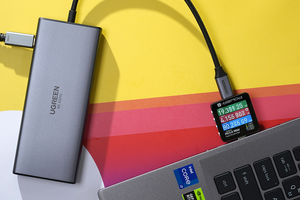 유그린(UGREEN) USB-C 9in1 허브는 외부 전원 없이도 동작하고 USB-C Input 포트에 PD 100W 어댑터를 연결하면 노트북을 충전시켜줄 수 있습니다. 이러한 기능은 적은 숫자의 USB-C 포트만 탑재한 맥북 에어와 같은 노트북이나 태블릿에서 활용할 때 유용한 기능입니다. 참고로 테스트 결과 약 80W 정도로 노트북이 충전되었습니다.