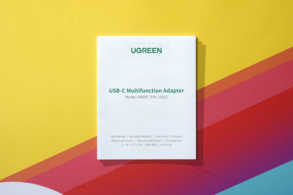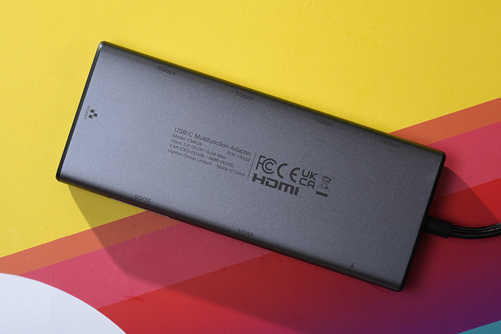 유그린(UGREEN) USB-C 9in1 허브의 뒷면을 살펴보면 각각의 단자들이 어떤 역할을 하는지가 설명되어 있습니다. 그리고 모델 번호는 CM639이고 P/N은 15532입니다.