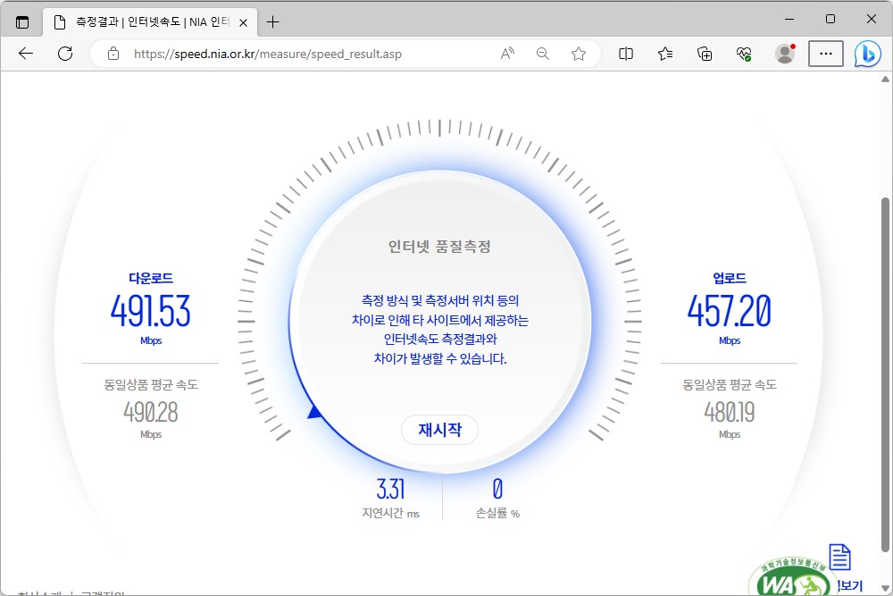 그 외에도 유그린(UGREEN) USB-C 9in1 허브의 RJ45 유선랜 포트에 KT 인터넷 베이직 500MB 상품을 연결해서 속도를 측정했더니 대역폭의 한계까지 뽑아준느 것을 확인할 수 있습니다.