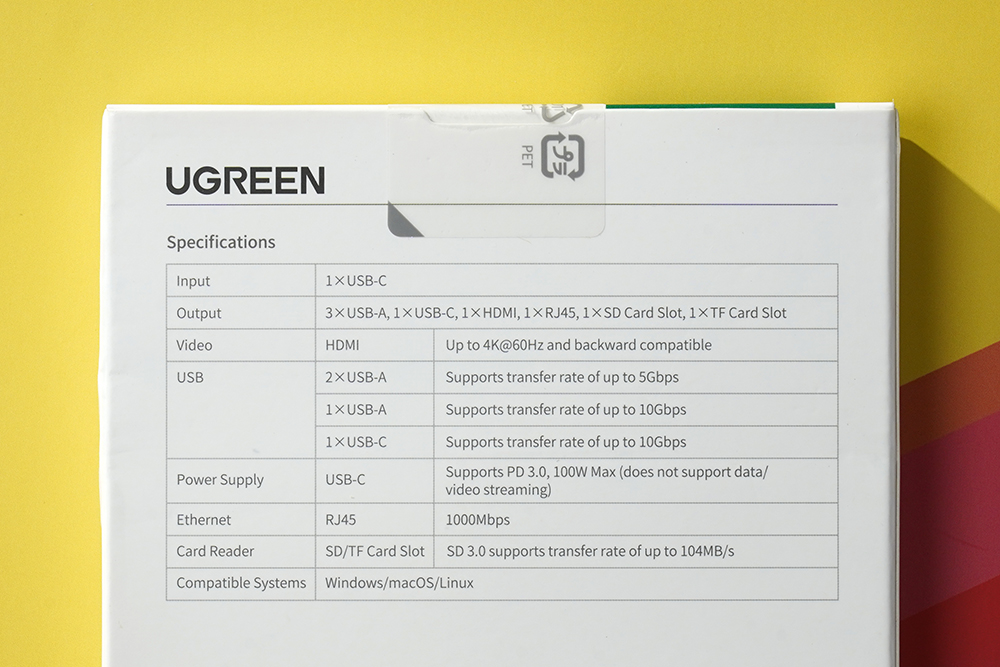 박스의 뒷면에는 유그린(UGREEN) USB-C 9in1 허브의 스펙이 표시되어 있습니다. 입력은 USB 타입C 포트를 통해서 받을 수 있고 3개의 USB-A, USB-C, HDMI, RJ45(유선랜), SD/마이크로SD 카드 리더기로 구성되어 있습니다. 특히 PD 3.0 100W 입력을 받을 수 있다는 점이 편리한 부분입니다.